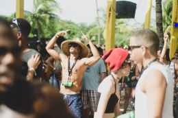 topless man raising his hands