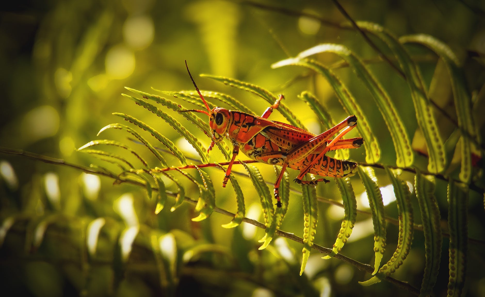 close up photo of grasshopper perched on fern plant
