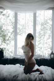 photo of woman kneeling on bed
