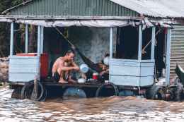 man pouring water from dipper on blue and grey house
