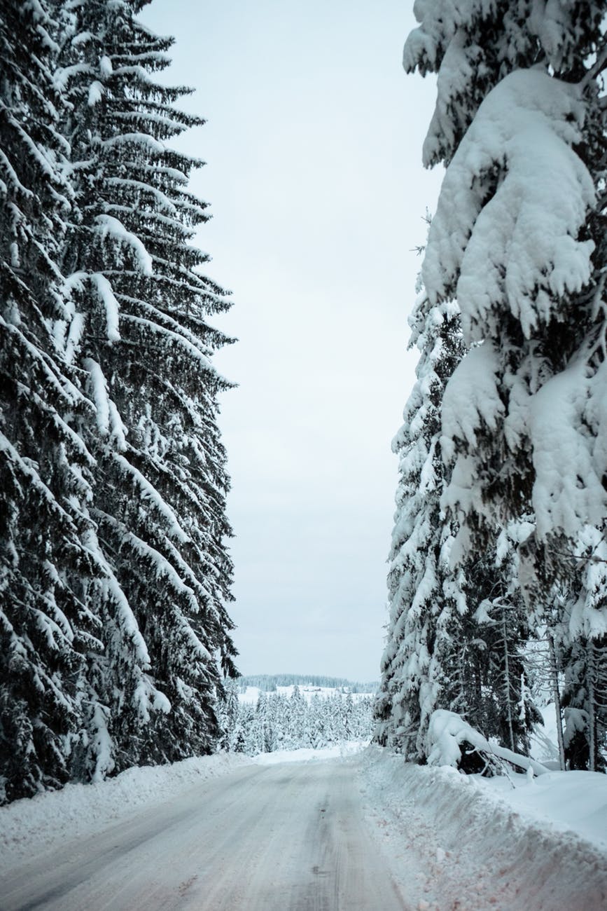 snow covered pine trees