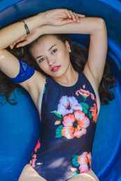 photo of woman in blue floral one piece swimsuit lying down with hands over head April 1, 2020April 1, 2020