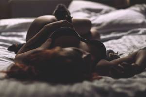 woman in black brassiere lying down on bed with rats