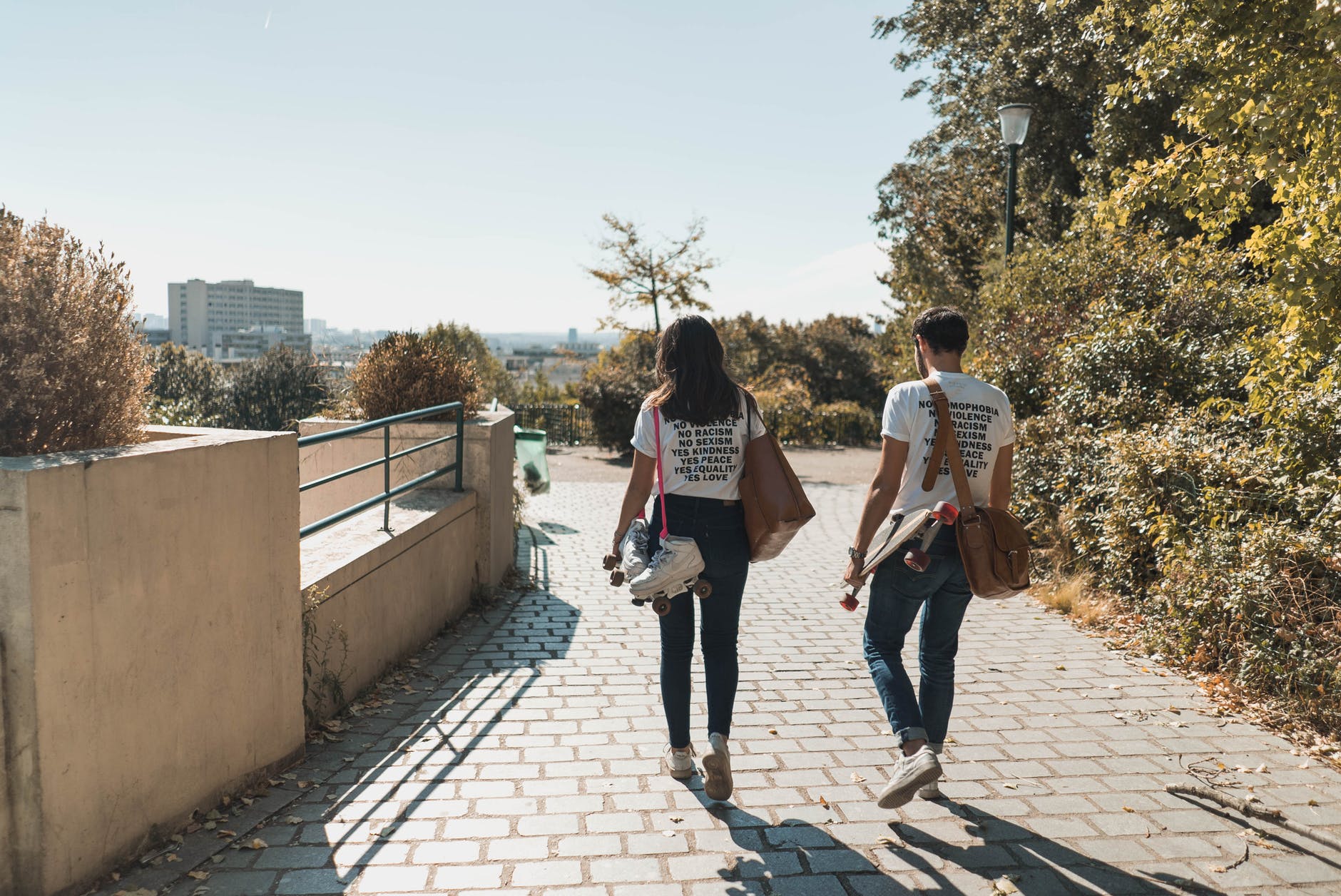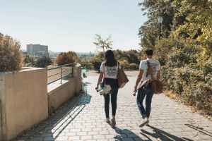 man and woman walking on paved bricks