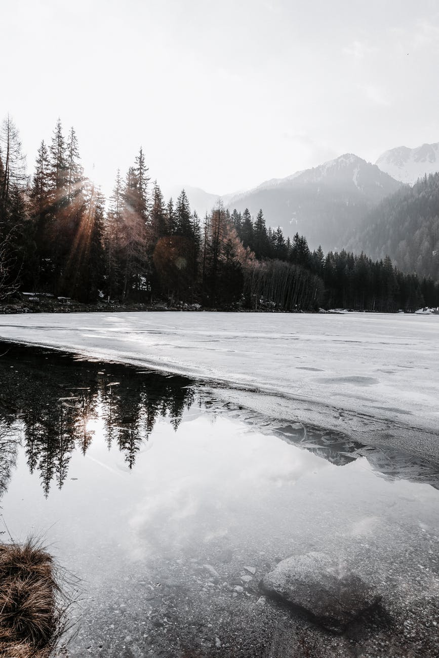 green pine trees beside body of water