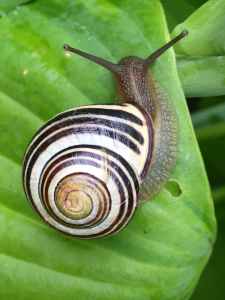 white black and brown snail on green leaf