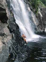 person sitting on rock near water falls
