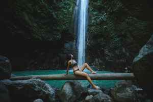 woman sitting on tree log