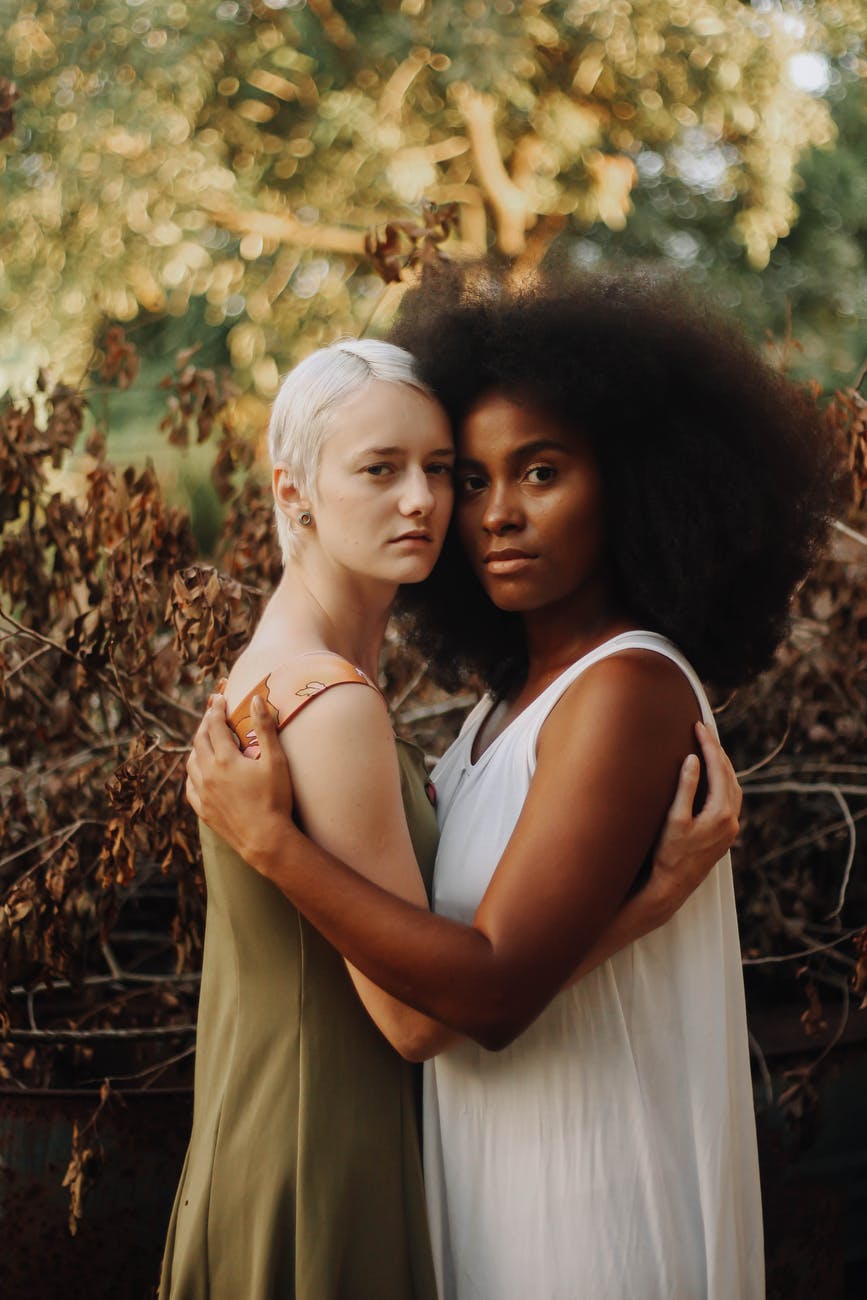 two women standing wearing dresses