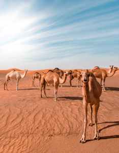 bunch of camels in desert dune