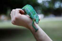 green reptile on hand