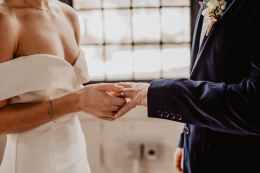 woman putting wedding ring on groom s finger