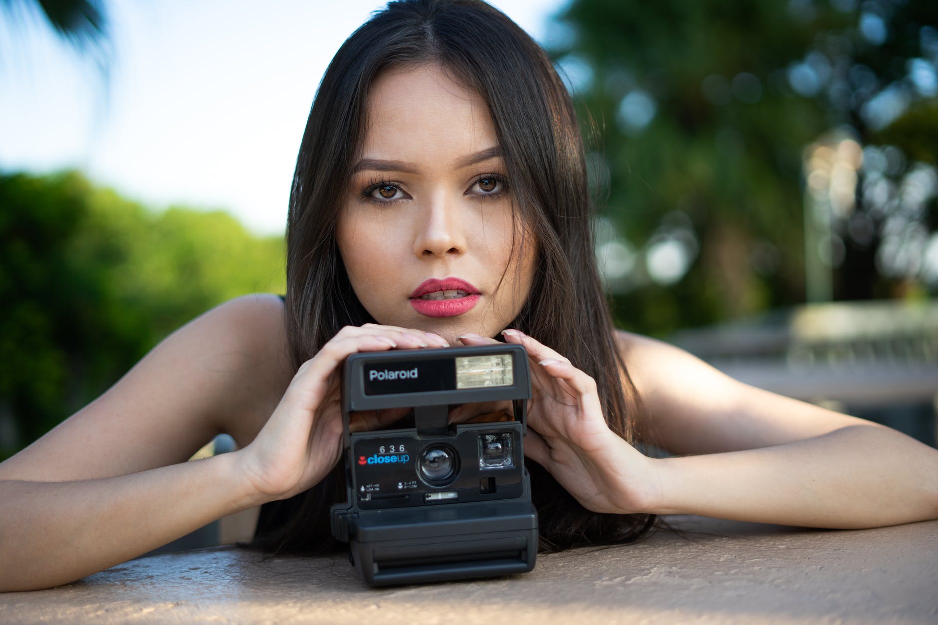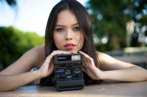 portrait of woman holding gray polaroid camera