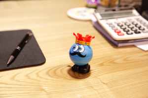 blue round plastic toy on a desk