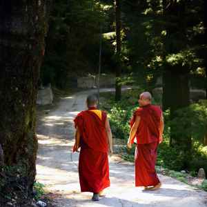 two monks walking on trail lined with trees