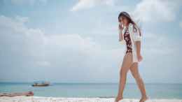 photo of woman in floral swimsuit and white dress shirt standing on her toes at a beach April 1, 2020April 1, 2020
