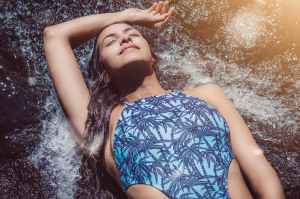 close up photo of smiling woman with her eyes closed in blue one piece swimsuit lying on body of water April 1, 2020April 1, 2020