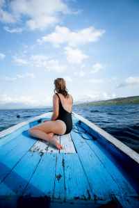 photo of woman sitting on wooden boat