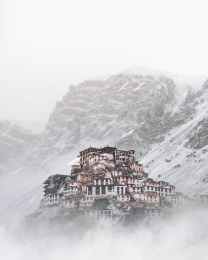 landscape photo of a village by a snowy mountain