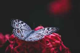 silver and black butterfly on red artificial flower