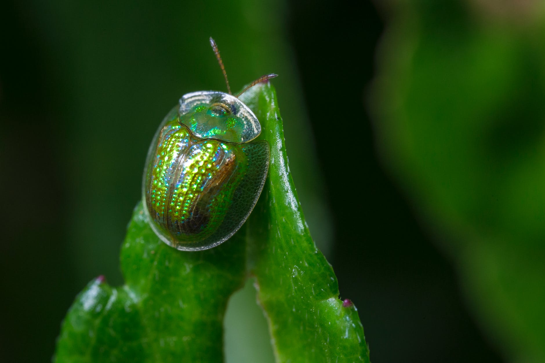 macro photography of green beetle on green leaf