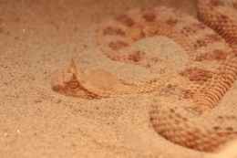 close up photo of a brown sidewinder snake on sand