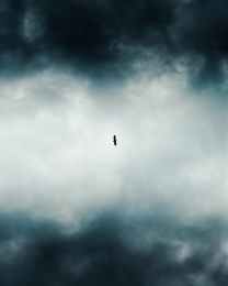 low angle photo of bird flying across dark clouds