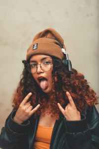 woman wearing leather jacket with tongue out
