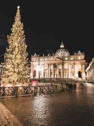 lighted holiday tree in front of building