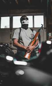 man wearing mask carrying rifle