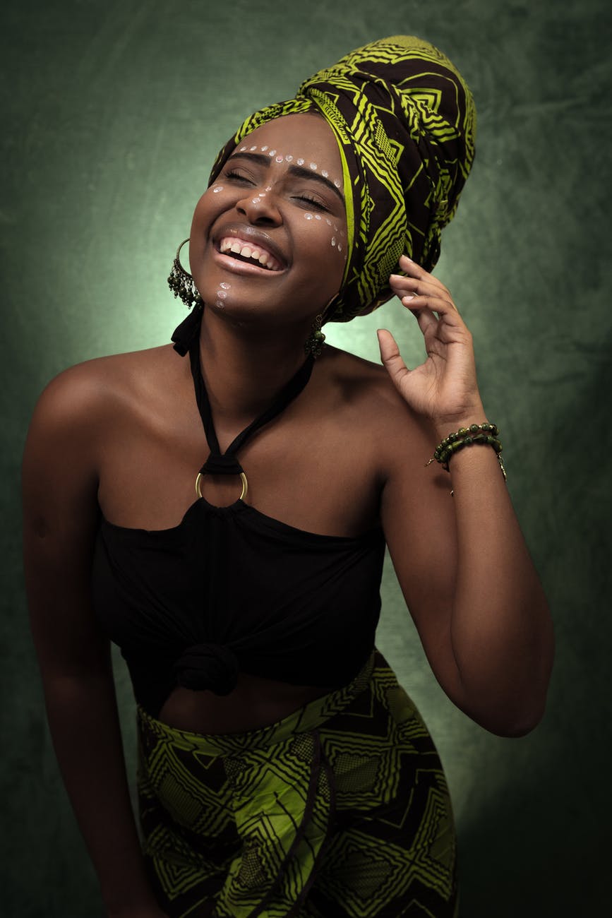 photo of smiling woman in african headscarf and skirt and black halter top laughing with her eyes closed March 16, 2020