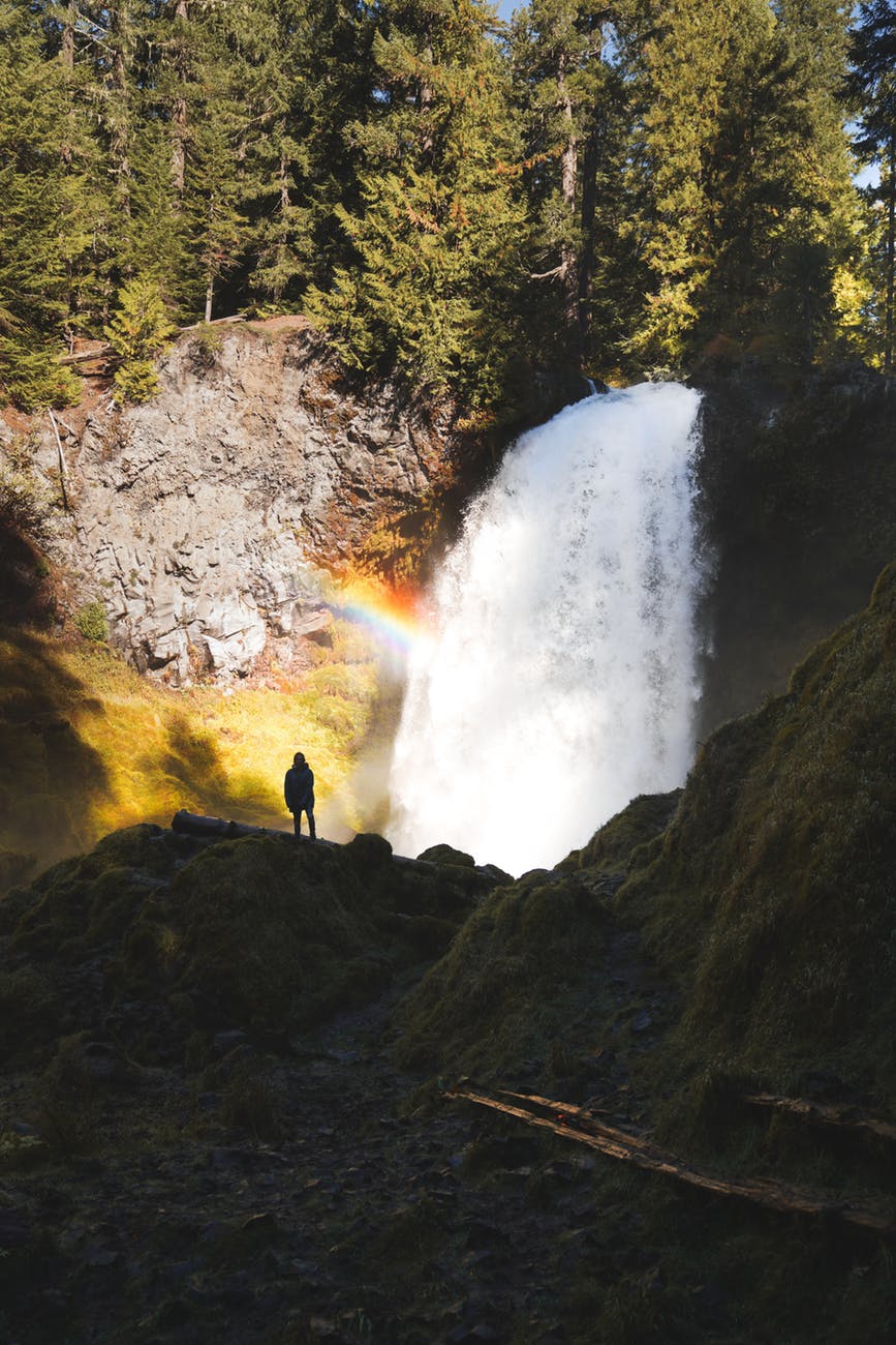 person standing on rock looking at waterfalls