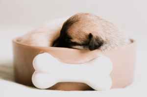 selective focus of brown and black puppy sleeping inside brown bowl