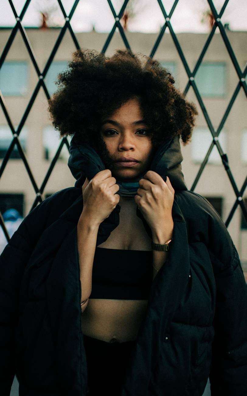 woman wearing a black jacket standing standing in front of a metal fence