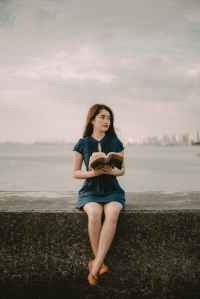 selective focus photography of sitting woman holding open book