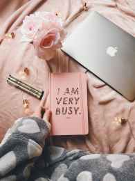 silver macbook beside planner and flowers