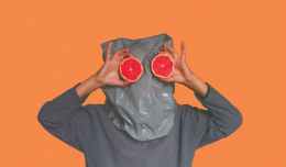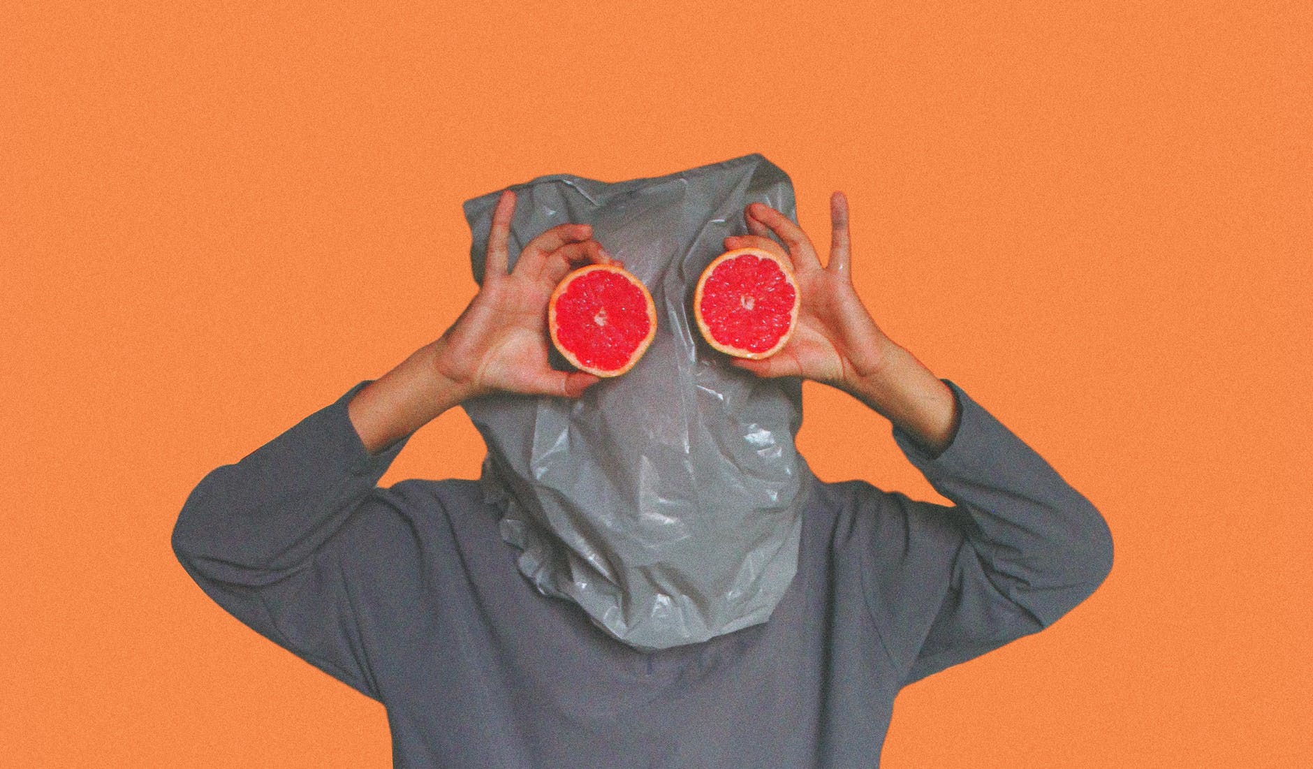 person covered with plastic bag on head while holding sliced blood orange