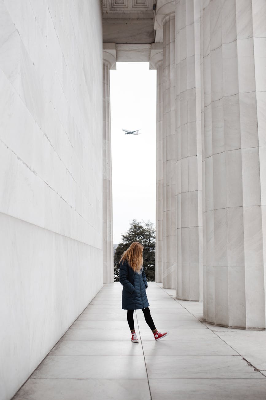 woman standing near marble pillars