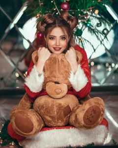 woman wearing santa costume while hugging teddy bear