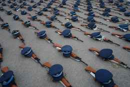 photo of blue caps and rifles on floor