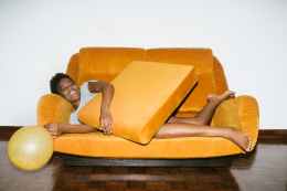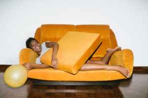 woman lying on orange sofa