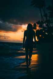 silhouette of a woman walking on beach during sunset