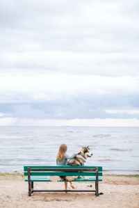 woman sitting in a beach bench with her pet