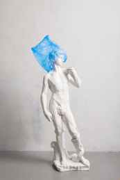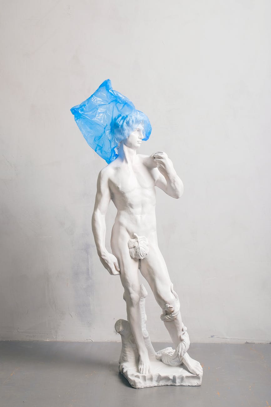 white nude sculpture covered blue plastic on head