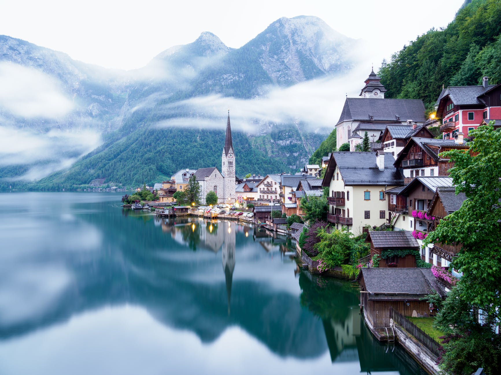 houses near lake and mountain