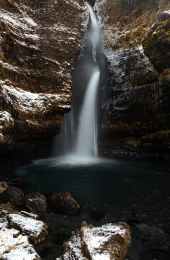 water falls on rocky mountain