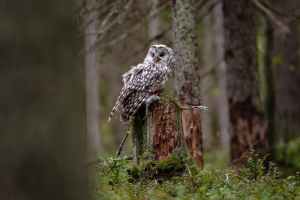 white and black owl on brown tree branch