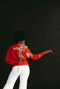 dancing black woman hiding flower behind back in studio