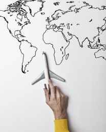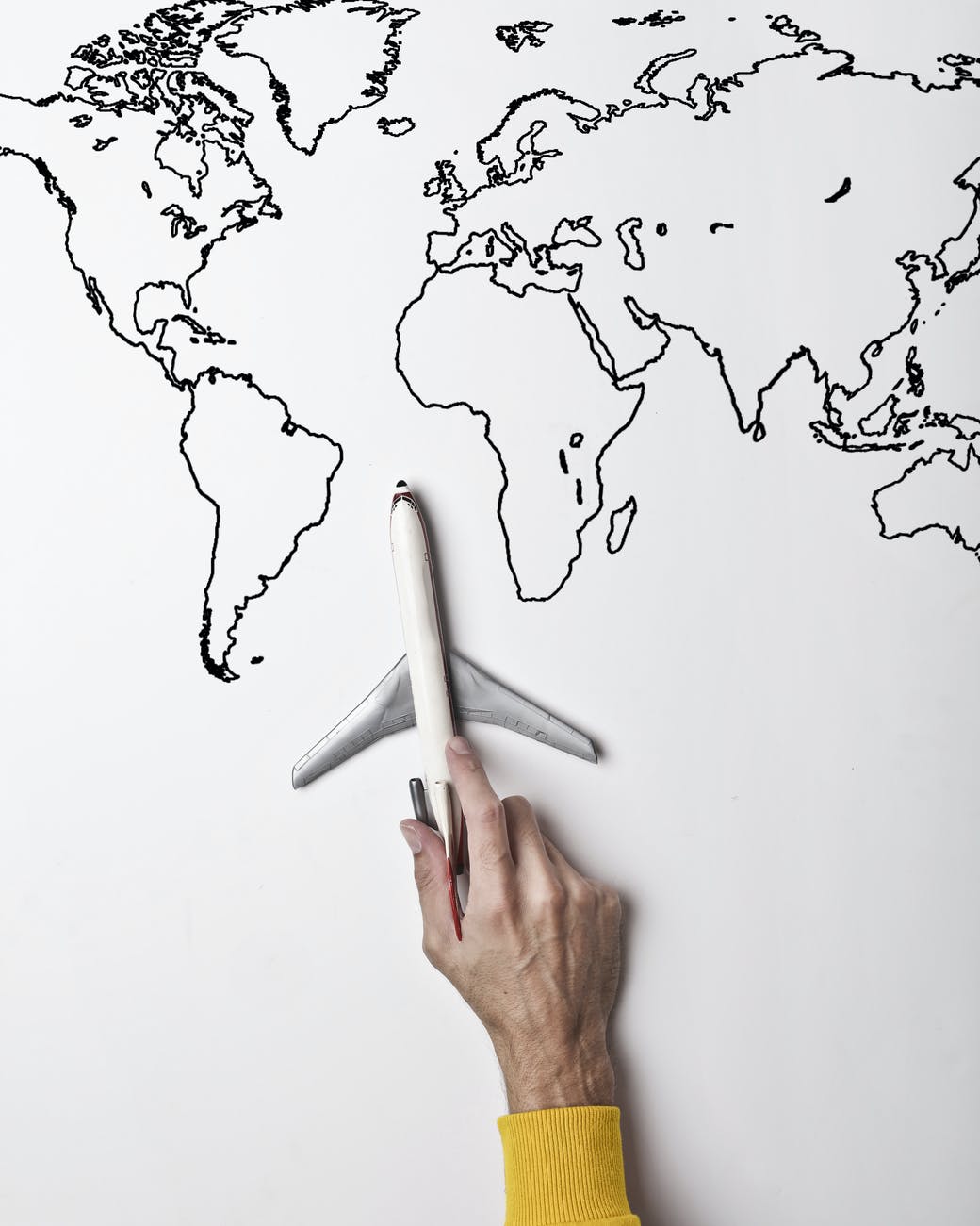 person holding small toy airplane against black and white map as concept of travel and vacation August 15, 2020