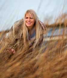 photo of smiling woman in brown fur coat bending over brown grass field